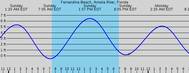 The tide chart above shows the height and times of high tide and low tide for Fernandina Beach Amelia River Florida. The grey shading corresponds to nighttime hours between sunset and sunrise at Fernandina Beach Amelia River. As you can see on the tide chart the highest tide of 623ft was at 311am and the lowest tide of 033ft will be at 938pm.