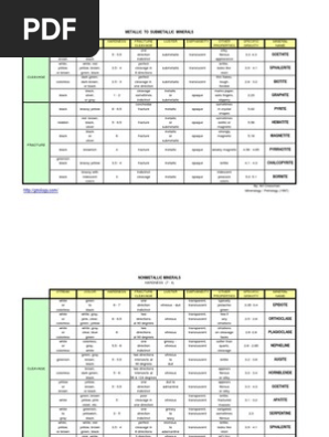 Inside the front coverwrite a proper definition for. The minerals are found in limestone or dolostone the rock is dolostone the mineral is dolomite and marble. METALLIC TO SUBMETALLIC MINERALS FRACTURE STREAK COLOR HARDNESS FRACTURE LUSTER DIAPHANEITY OTHER SPECIFIC MINERAL CLEAVAGE CLEAVAGE PROPERTIES GRAVITY NAME yellow yellow one silky or brown 5 - 55 direction submetallic translucent fibrous 33 -43 GOETHITE brown black indistinct appearance white white red.