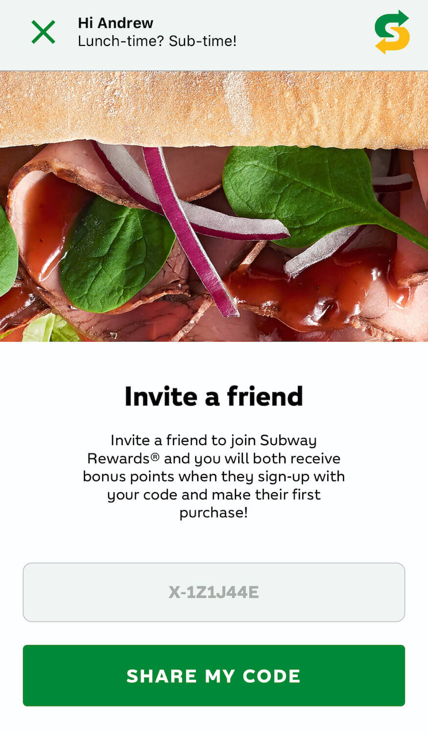 Step 4- Click on Redeem now and confirm. 48 points for a FREE MINI size sub 72 points for a FREE REGULAR size sub Sub-in-a-Tub or Wrap. You will automatically earn reward dollars every time you make a food or beverage purchase at a Subway restaurant and scan your Subcard either a physical Subcard or using the QR code on the virtual card via the Subway app.